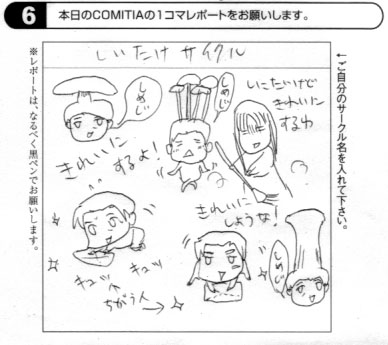 濱っちにiPhoneを見せてもらう。指を動かすと画面がぐりぐり動く。すげぇ、文明の利器だ! 見本誌を用意していたので、通りすがる人には「どうぞお手に取ってお読みくださーい」とか声をかけるKaL殿。しかし基本的にぽけーっと椅子に座ってたりぽけーっと立ってたりするのは眠い。眠いですよ。 眠い眠い言ってると、濱っちが肩もみしてくれました。うお、効く! ていうか、うあああ、てててて、あばばばば、あっお客さんが ![]() すいません(笑) コミティアのアンケート用紙。濱っちに任せていると、こんなカオスな状態に。 ![]() 左下がゆずぽん(濱田さんのキャラ)、右真ん中がコウさん。右上はレリさん。 しいたけを描いたのにうっかり「しめじ」、エノキを描いたのにまたうっかり「しめじ」、そしてエリンギは確信犯。 ていうか、これだけしめじしめじ言ってながら「しいたけサイクル」か!(笑) 本は思ってたより売れて(1冊も売れないのを覚悟してた(笑))カバンが結構空いたので、宅急便で送らずにそのまま持ち帰ることにしました。キャスター付きなのでごろごろと転がして帰りますよ。 店番手伝ってくれた濱っちありがちょう! この後は、Avalonが根城にしているティンタジェル城の2周年パーティがあるのですが、水嘉さんを誘ったら興味があるとのこと。よっしゃ。水嘉さんはバイクで来ていたので、目白駅でまた合流する事になりました。 歩きながら水嘉さんと話していて、じゃあそういうことでーと別れたたところで、 ![]() そしてこの俺は誰だ。 ゴロゴロと荷物転がして、来た道を引き返しました…。 |