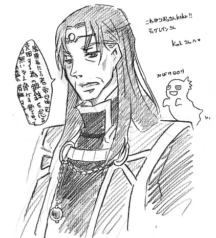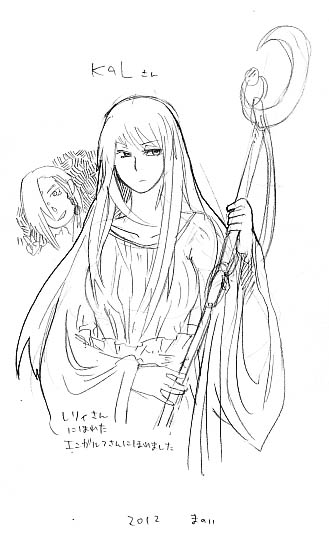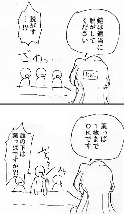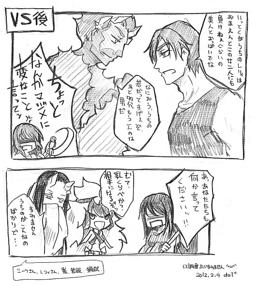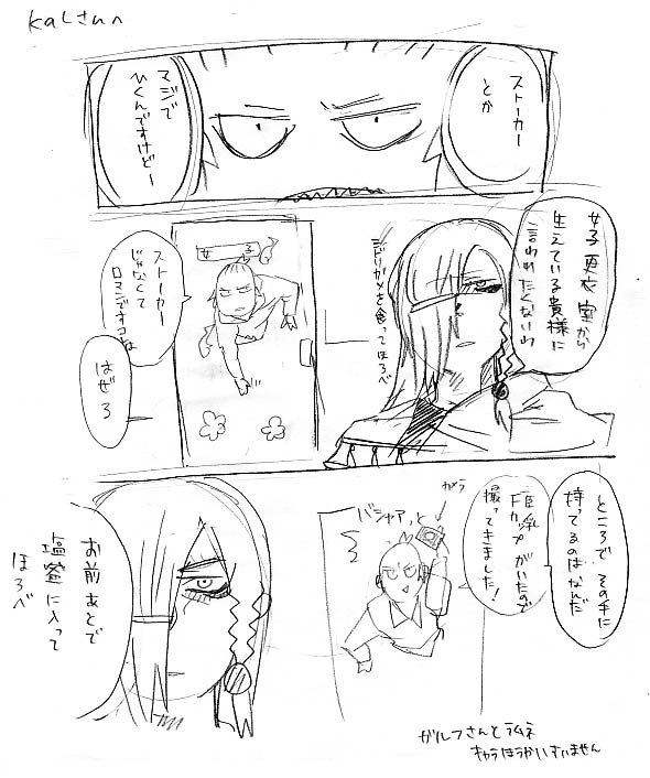 続いては、くじ引きで当たった相手のキャラと自分のキャラのコラボ絵がお題。dal*さんを引いて、嵬とシークが仲良く(?)戯れてる所を描いた…と思います。青いでかい似た者同士。 描いてる最中、KaL殿いつもの注釈を言い忘れたことに気づく。資料本のコウとシークとシュリアストは鎧を着てるので… ![]() いや、葉っぱの上に下着着てタブレット(鎧下)来て鎧だと思いm…それはかえって不自然か。むしろ3人そろって変態ですか。 変態と言えばはねりさんちのミヤヴィの変態っぷりが色々すごい。それを語るはねりさんがキラキラして見えたのは気のせいでしょうか(笑) ひたばさんのキャラを描こうとして、1冊しかない資料をお借りしようと… ![]() 「資料」と言おうとしたんですがはっきり「ひりょう」でした。したばさんのひりょう。すみません。 楽しくおしゃべりなどしながら描き描き。今回のKaL殿はネタ絵はほとんど描かなかった、ような、気がします。…気がします。 描いた中で覚えてるのは…、「〜など不要」の決め台詞(?)で毎度ネタになる阿波さんちのシャルル、彼は安定のネタ扱いでした。葉っぱなど不要。ごめん。 楽しい時間はあっと言う間に過ぎ、退出のお時間。 新宿にある区民センターということで、新宿民がいるとお安くなる…のかな? 阿波「新宿にお住まいの方…」 うーん、KaL殿残念ながら新宿ではないなぁ。北海道だしなぁ。(惜しくも何ともない誤差800km) 撤収前に、このみさんがお持ちになった納豆せんべいをいただく。意外と分厚い。食べてみると…あ、納豆! 納豆だよ! 感動! 片づけが意外に早く終わり、予約していた夕食の時間まで30分以上ある計算に。むう。 メグロ「這っていけば丁度いいかも」 おなご10人が新宿の街をほふく前進……怪しすぎる(笑) |
