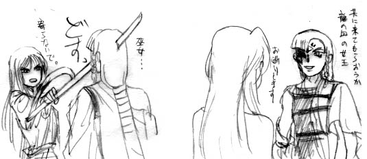 ぱっつんバトン★ 自分の好きなキャラの前髪(っぽい毛でもOK)を、 今流行りのぱっつんにして描いてみましょう!!何キャラやってもOKです(^-^) また、そのぱっつん髪を見た別のキャラの反応の様子も別に描いてくださいね! レリィ「今回の指定は…、…エンガルフ…?」 ヴァル「はい早速切ってもらいましたー。こちら!」 ![]() フェイ「…何でこんな髪型でも自信たっぷりなのこの人!(笑)」 シュリ「若干…爽やか…だな…」 シーク「横のみつあみはセーフか(笑)」 レリィ「っていうか…まさかこんなネタのためにエンガルフの右側の模様描くことになるとは、おもわなかったわね…」 コウ 「ああ、実はMINSTRELSYの時から気になってたんだが、あの模様は何なんだい?」 フェイ「えーとね、MINSTRELSYでは明かされなかったっていうか、本筋に関係ないから伏線として拾うのやめちゃったっていう(笑)」 メディ「NARRATIVEで明かされるかもしれませんね」 ヴァル「はいそれでは皆さんの反応! こちら!」 ![]() シュリ「…妥当だな…」 フェイ「っていうか、この人はこんな髪型でもやってる事が普段通りっていうのがポイントなのかも知れないね(笑)」 コウ 「この髪型で近衛を壊滅状態にされたら、俺は死んでも死に切れんなぁ…」 |